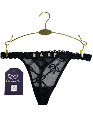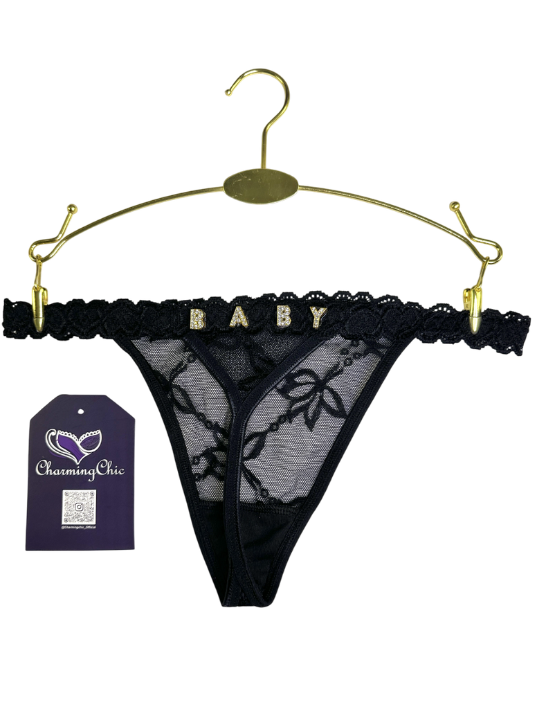 Crafted with soft floral lace, sheer mesh, and a flattering low-rise cut, this thong features sparkling gold or silver letter charms across the waistband – customizable with your name, initials, or a cheeky word (up to 15 letters).